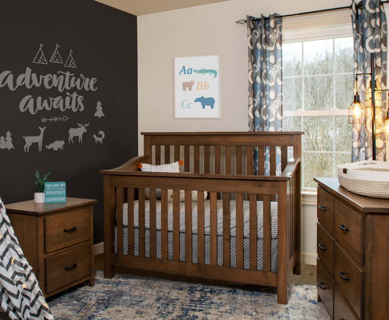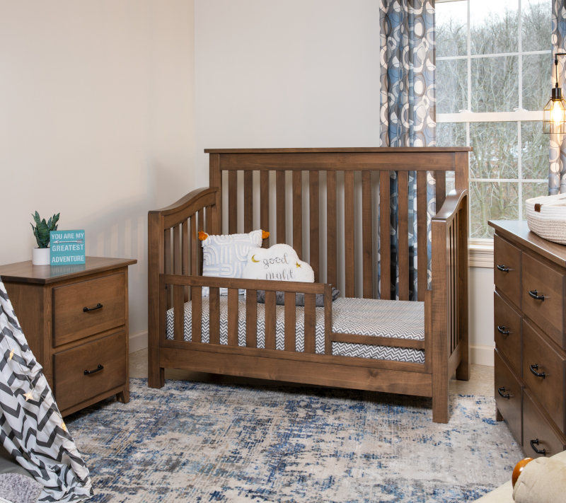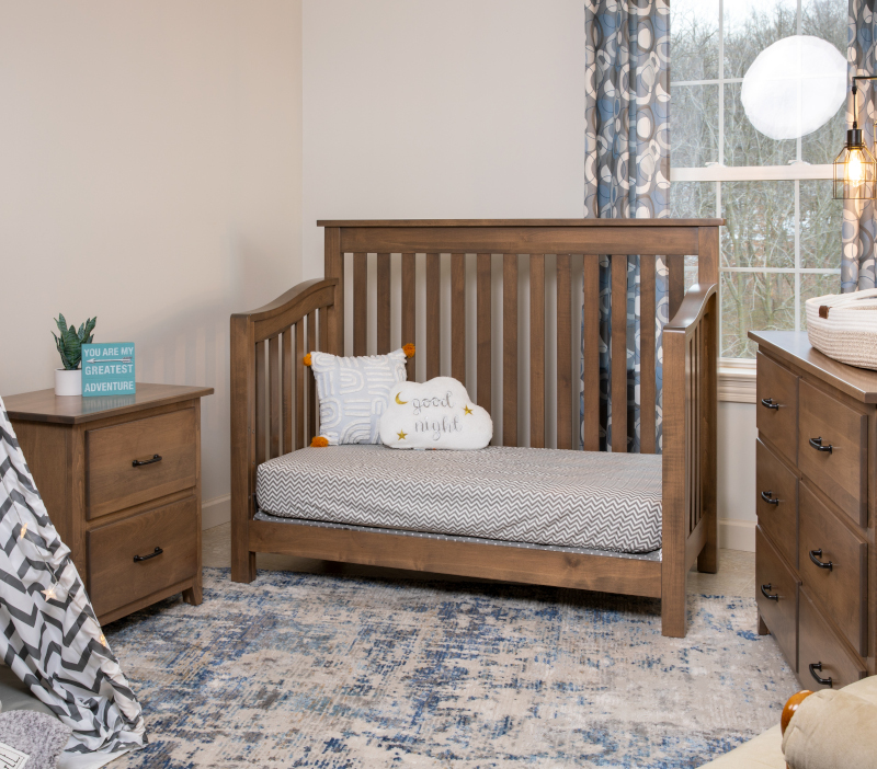 Our Amish Maddon Convertible Baby Crib, shown here in Brown Maple with Husk stain, is beautifully handcrafted in the USA by skilled Amish craftsmen.  Our American made baby furniture is made of solid wood from responsibly managed forests in the USA.  Our solid wood crib designs are convertible & can grow with your child into toddler beds, day beds & full beds.  Our 4 in 1 convertible baby cribs come with a heavy duty, powder coated crib spring.  Made in Pennsylvania.