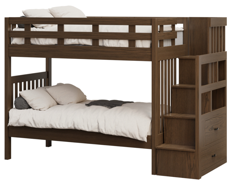 Our Amish Kodiak Bunk Bed with Steps & Drawers, shown here in Red Oak with Carbon stain, is beautifully handcrafted in the USA by Amish craftsmen and fits two standard size mattresses. Top bunk has guardrails on both sides for ultimate security. Our American made children's furniture is made entirely of solid kiln dried hardwoods grown and harvested responsibly within 250 miles of our builder's studio. Made in Indiana.