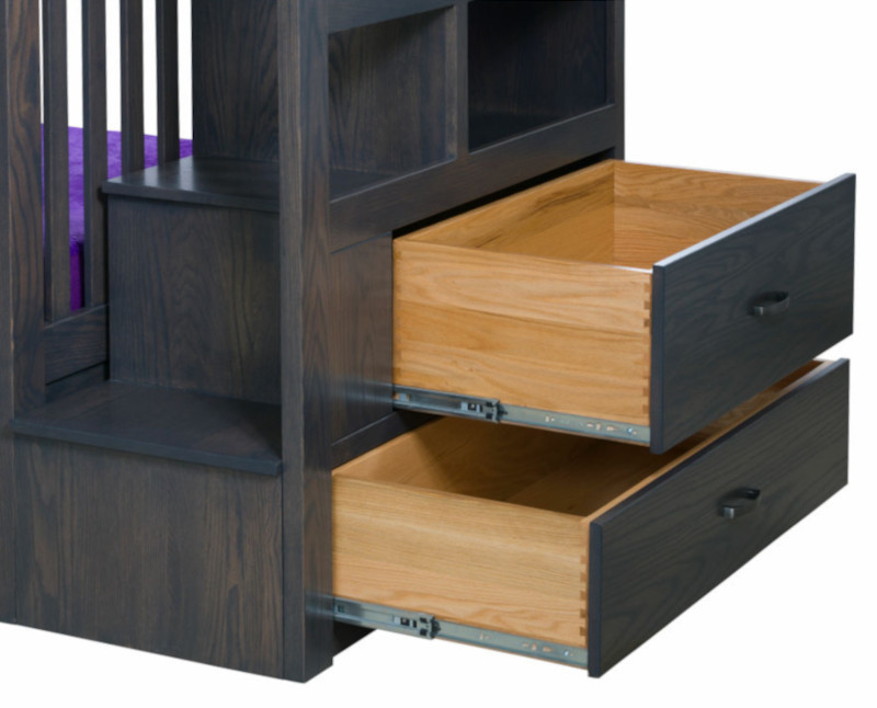 Our Amish Kodiak Bunk Bed with Underbed 3 Drawer Storage Unit, shown here in Red Oak with Carbon stain in first picture, is beautifully handcrafted in the USA by Amish craftsmen and fits two standard size mattresses. Top bunk has guardrails on both sides for ultimate security. Our American made children's furniture is made entirely of solid kiln dried hardwoods grown and harvested responsibly within 250 miles of our builder's studio. Made in Indiana.